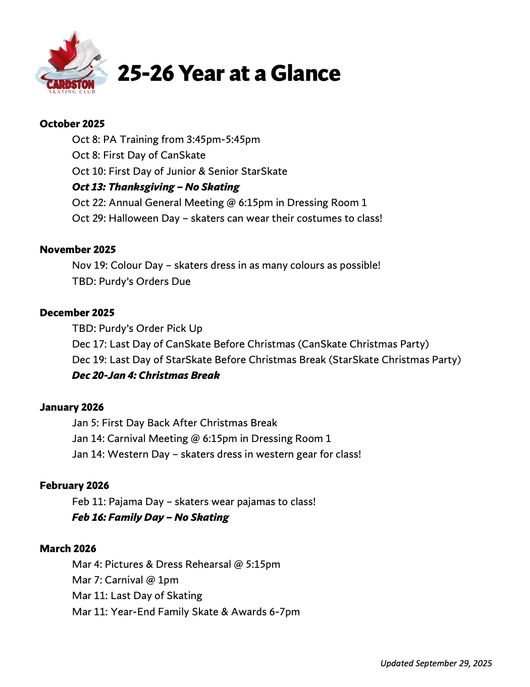 WELCOME TO THE CARDSTON SKATING CLUB! REGISTRATION IS STILL OPEN Stay up to date on all things CSC on our Facebook and Instagram pages! Check out our Year-at-a-Glance below for all the important dates this season: